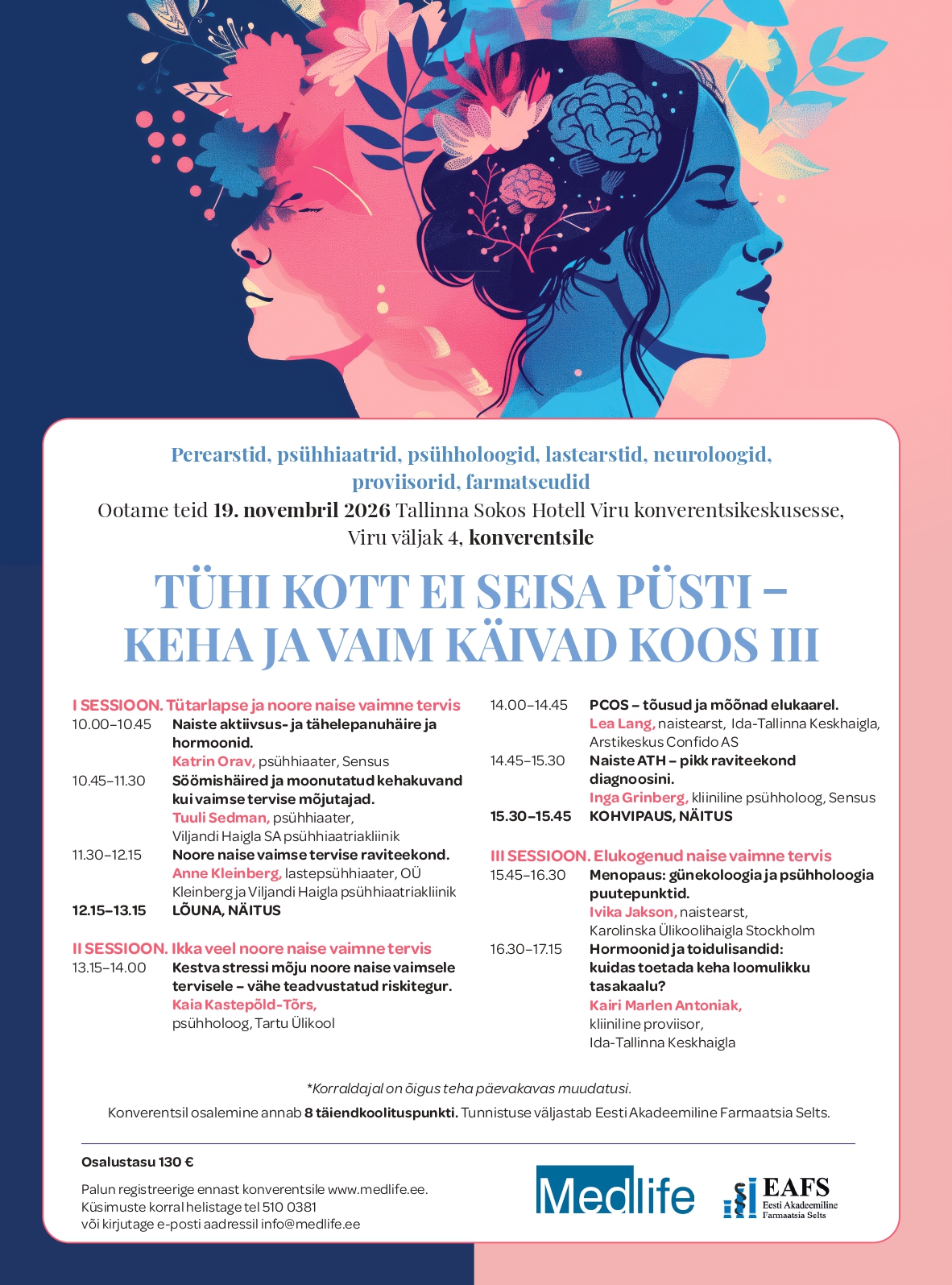 Ootame teid 19. novembril 2026. a. Apteek TÄNA ja EAFS-i konverentsile “TÜHI KOTT EI SEISA PÜSTI – KEHA JA VAIM KÄIVAD KOOS III”, Tallinn Sokos Hotell Viru  konverentsikeskusesse Viru väljak 4.