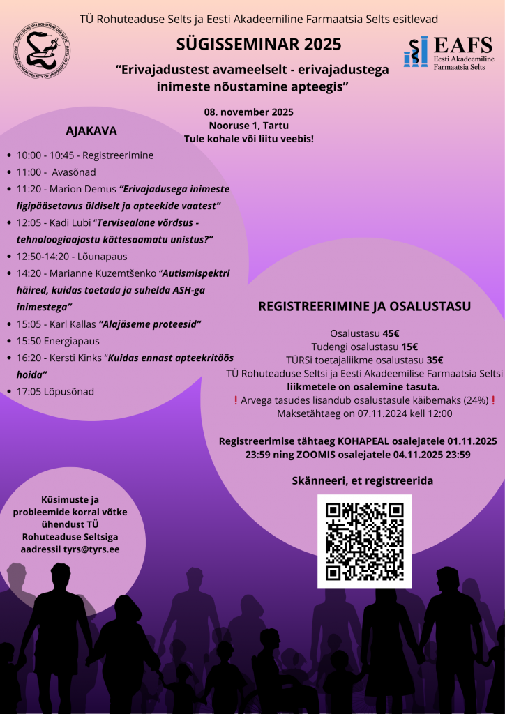 Sügisseminar 2025 By Ivo Laidmäe Published 25. juuni 2025 Koolitus, Määratlemata TÜ Rohuteaduse Selts ja Eesti Akadeemiline Farmaatsia Selts kutsuvad Sügisseminarile 2025.